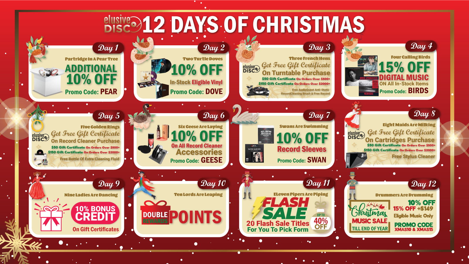 Starting Saturday, December 13th, Elusive Disc will announce a new exclusive holiday promotion each day for our 12 Days of Christmas event. Every day features a different special offer — including deals on vinyl, turntables, cartridges, accessories, gift certificates, and more.
