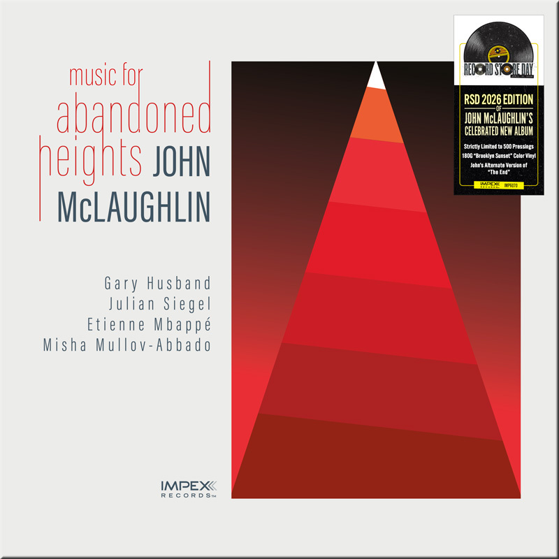 Impex Records is proud to present an exclusive Record Store Day 2026 edition of guitar icon John McLaughlin's surprising new jazz fusion LP. The unexpected 2025 audiophile hit release of an in-development film score features McLaughlin's signature fiery, complex style and yearning spiritual exploration, bringing dramatic sweep to both hot-fusion rave-ups and evocative ballads. His scorching electric and mellifluous acoustic guitar melodies are boosted to incredible heights by the virtuosic performances from Gary Husband (drums/keyboards), Julian Siegel (saxophone), Misha Mullov-Abbado, and Etienne Mbappé (bass). These industry vets spark fire on heavier tunes like "The Scene" and introspective delicacy on the ballad "Nathaniel and Christine," creating one of the most unexpected independent jazz releases of the year! The Record Store Day version is limited to 500 copies and pressed on "Brooklyn Sunset" swirl 180-gram vinyl at Record Technology. It delivers spectacular sound and is the only way to experience McLaughlin's personal version of the album closer "The End." Music for Abandoned Heights is a can't-miss pick up for fans of John McLaughlin and great jazz-rock music!