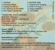 "Comparing Sticks showed how straight CD-quality recordings done right are all we could really want if the full dynamic range available to be encoded actually was. It's not the format's fault if most decide to drive it with the tank mostly empty. That means hitting the road when one is down to less than ten decibels of recorded dynamic range. No wonder that 99.9% of all recordings never even see much less hit the limits of CD-quality resolution. Hang Around knows better; again. It behaves and sounds like a very good hence rare high-resolution effort but uses an ordinary CD carrier. On it three very experienced musical journeymen improvise freely while Tony [Minasian] did the absolute minimum behind the scenes - probably just gain matching three microphones. The jamming here is characterized by two instruments which essentially only play one note at a time each. That eliminates the type [of] harmonies a guitar or keyboard contribute traditionally. With its added percussion, Hang Around is thus mostly an exercise in rhythmic textures surrounding simple melodic snippets conjured up in the moment. Musically, it's thus more lightweight and in contrast to the unusually high sonic quality. In short, I'd listen to Hang Around more to show off my system's audiophile aspects than to enchant someone with advanced musical magic. But Tony Minasian promises there's more comign down this pike. Let's give him some time to fully develop his particular recipe... What's the moral of this story? 16-bit/44.1kHz can sound amazing when someone cares deeply to make it so. Tony's albums make that point." - Srajan Ebaen, www.6moons.com